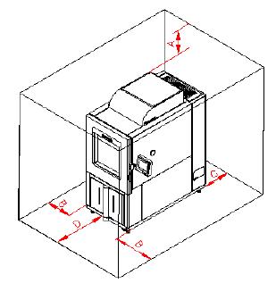 12.7 安裝場地 | 地面平整,通風(fēng)良好 設(shè)備周圍無強(qiáng)烈振動(dòng) 設(shè)備周圍無強(qiáng)電磁場影響 設(shè)備周圍無易燃、易爆、腐蝕性物質(zhì)和粉塵 設(shè)備周圍留有適當(dāng)?shù)氖褂眉熬S護(hù)空間,如下圖所示: A:不小于10cm B:不小于60cm C:不小于60cm D:252 型:不小于80cm 408 型:不小于90cm 1000 型:不小于120cm
